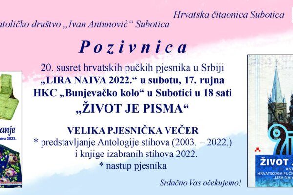 Jubilarni, dvadeseti susret hrvatskih pučkih pjesnika pod nazivom Lira naiva 2022. održan je u Subotici pod geslom Život je pisma u organizaciji Hrvatske čitaonica i Bunjevačko-šokačke knjižnice Ivan Kujundžić pri Katoličkom društvu Ivan Antunović Subotica.